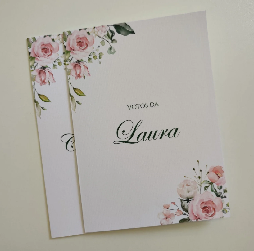 Ideal para registrar votos e mensagens pessoais no dia do casamento, este cartão pode ser utilizado durante a cerimônia ou como lembrança especial. Para conservar, mantenha em local seco e longe da luz direta para preservar as cores e a integridade do papel.