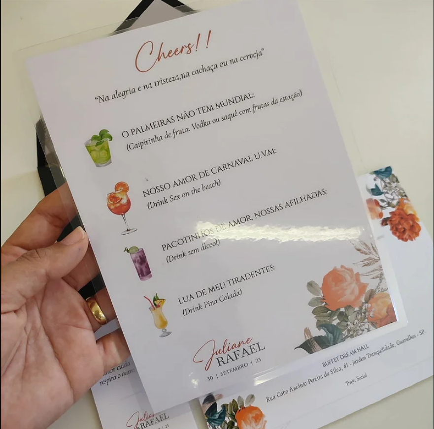 Entre os principais benefícios, destacam-se: material plastificado resistente, que protege contra sujeiras e umidade; design exclusivo Bellagi Convites, que traz um toque personalizado e sofisticado; tamanho ideal para fácil manuseio e leitura; facilita a escolha de drinks e bebidas pelos convidados; além de ser uma peça prática e reutilizável.